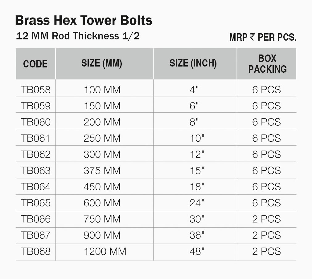 The Brass Hex Tower Bolt from PINE Hardware is a high‑quality hardware locking solution designed to provide dependable security and decorative appeal for doors, windows, cabinets, and furniture panels. This Brass Hex Tower Bolt features a distinctive hex‑shaped design that enhances grip and visual style, while the solid brass construction offers excellent strength and corrosion resistance.