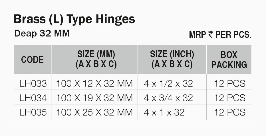 The Brass L Hinges Smooth Movement by PINE Hardware are precision‑crafted Brass L Hinges engineered for dependable performance and smooth opening/closing action. Their L‑shape makes them ideal for furniture doors, cabinets, wardrobes, and other panels that need a stable, reliable hinge solution. Manufactured by PINE Hardware, these Brass L Hinges Smooth Movement combine corrosion‑resistant brass construction with effortless movement for long‑lasting durability and everyday use.