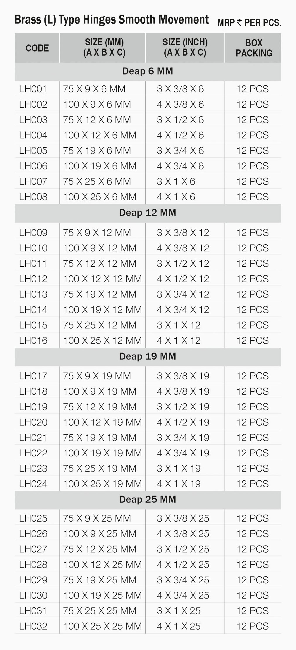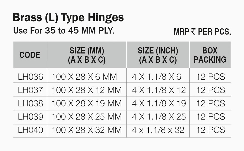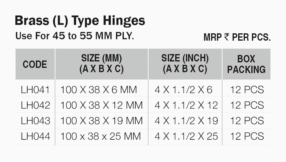The Brass L Hinges Smooth Movement from PINE Hardware are high‑quality Brass L Hinges designed to deliver smooth, low‑friction pivot action for doors, cabinets and furniture. Manufactured by PINE Hardware, these Brass L Hinges Smooth Movement offer reliable strength and lasting performance — perfect for residential and commercial hardware needs.