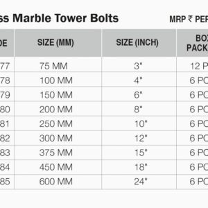 The Brass Marble Tower Bolt from PINE Hardware is a reliable and attractive door and furniture locking solution designed to secure doors, windows, cabinets, and other fixtures with strength and style. This Brass Marble Tower Bolt features a polished brass body with a distinct marble‑finish accent that adds both functional security and elegant detail to your hardware fittings.