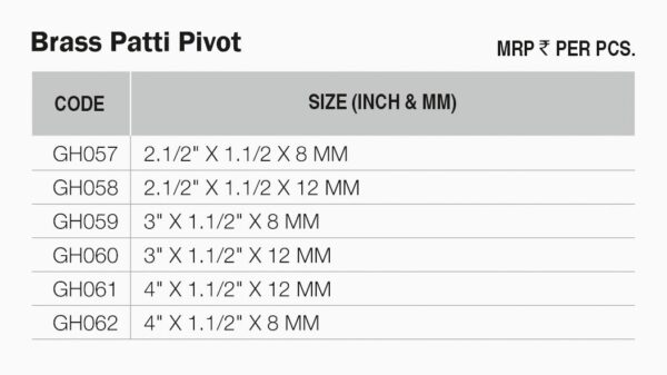 • Premium Brass Construction – The Brass Patti Pivot offers strong, long‑lasting durability and excellent corrosion resistance.