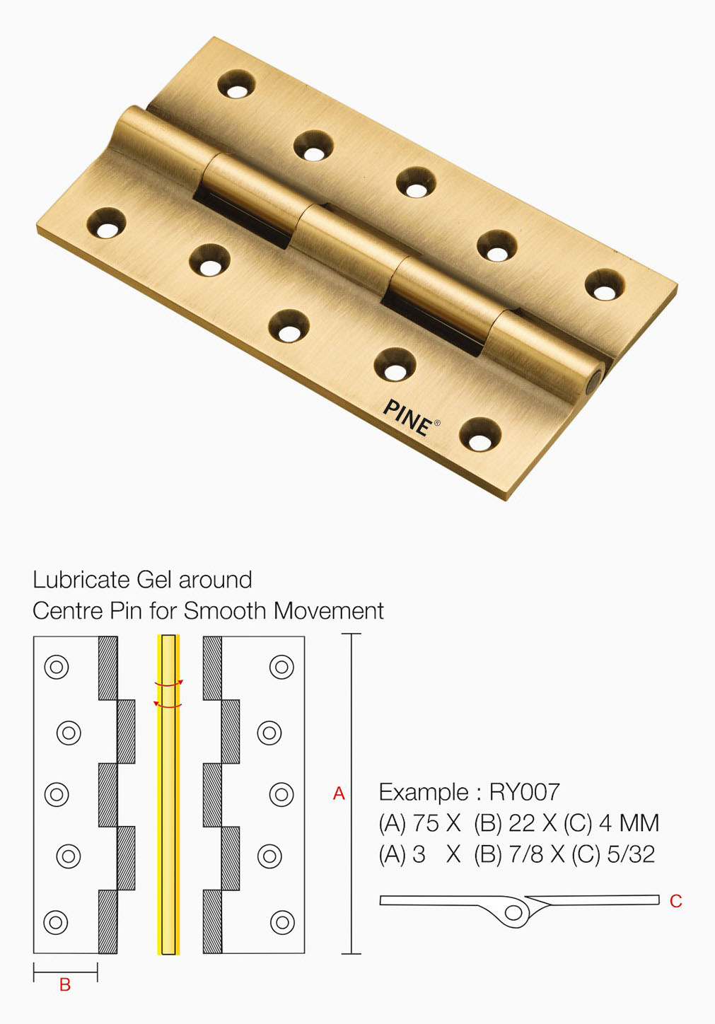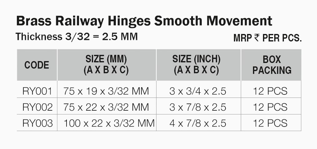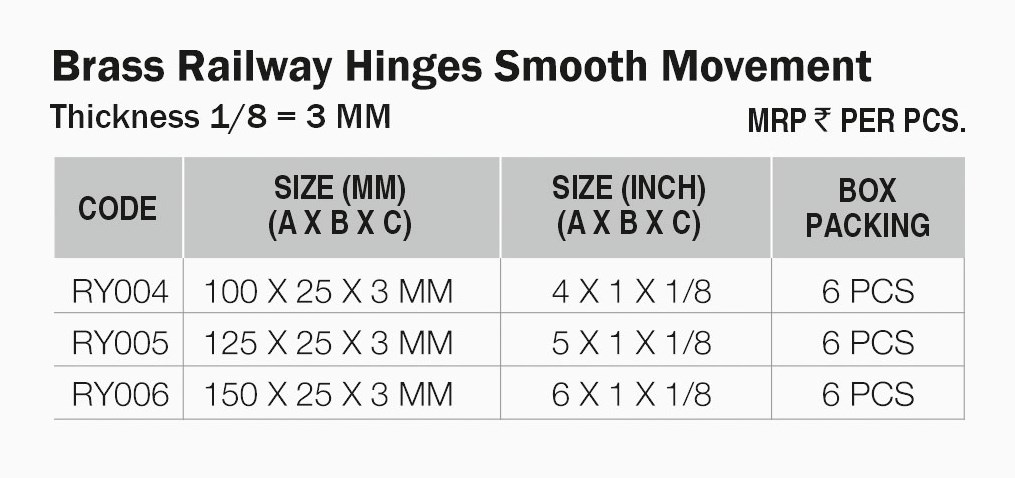 The Brass Railway Hinges from PINE Hardware are premium quality brass hinges designed for reliable pivot action on doors, cabinets and furniture. Manufactured by PINE Hardware, these Brass Railway Hinges deliver superior durability, smooth movement, and corrosion resistance.
