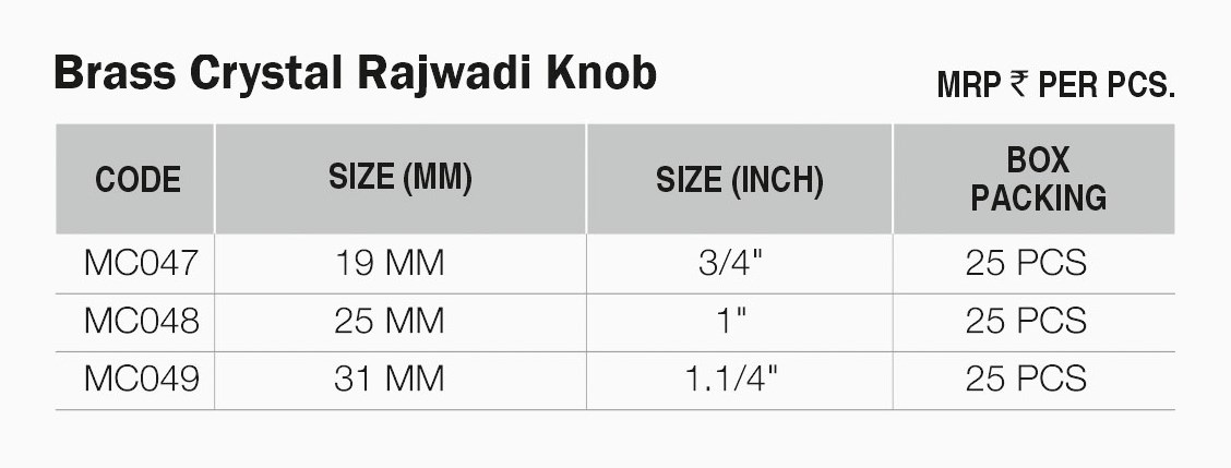 The Crystal Rajwadi Brass Mirror Cap from PINE Hardware is a beautifully crafted decorative hardware accessory designed to enhance mirror installations with a regal crystal‑accented finish. This Crystal Rajwadi Brass Mirror Cap functions as a stylish screw cover or cap that conceals exposed mounting hardware on mirrors, wardrobe panels, glass displays, and furniture surfaces, giving them a polished and elegant look.