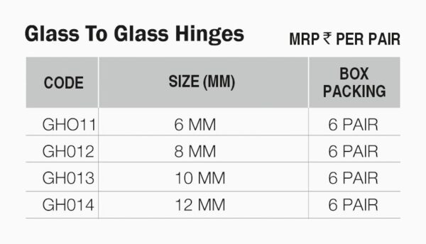 The Glass To Glass product offered by Pine Hardware belongs to the Glass Fittings category — engineered to provide a robust connection between two glass surfaces without the need for bulky frames. This Glass To Glass fitting ensures a clean, seamless finish that’s perfect for glass partitions, shower enclosures, display units, and other contemporary glass applications.