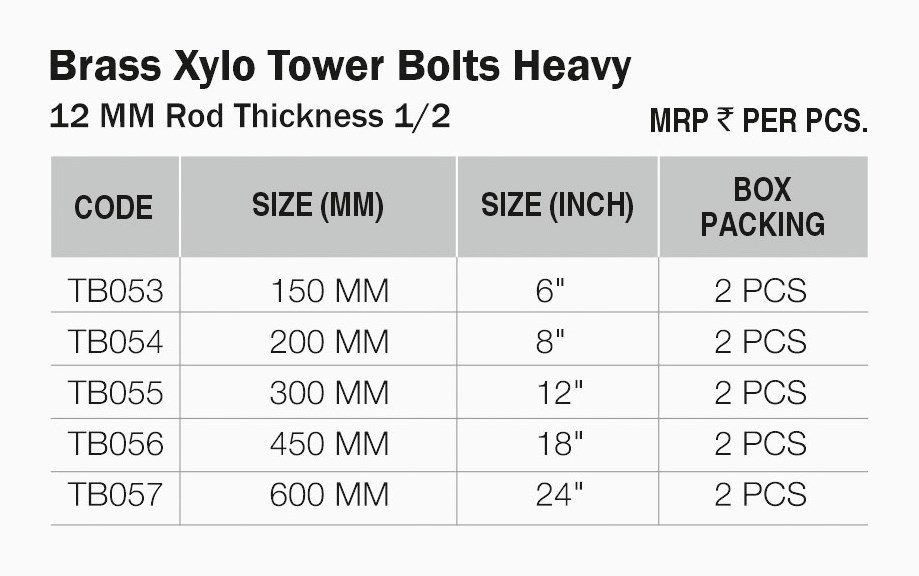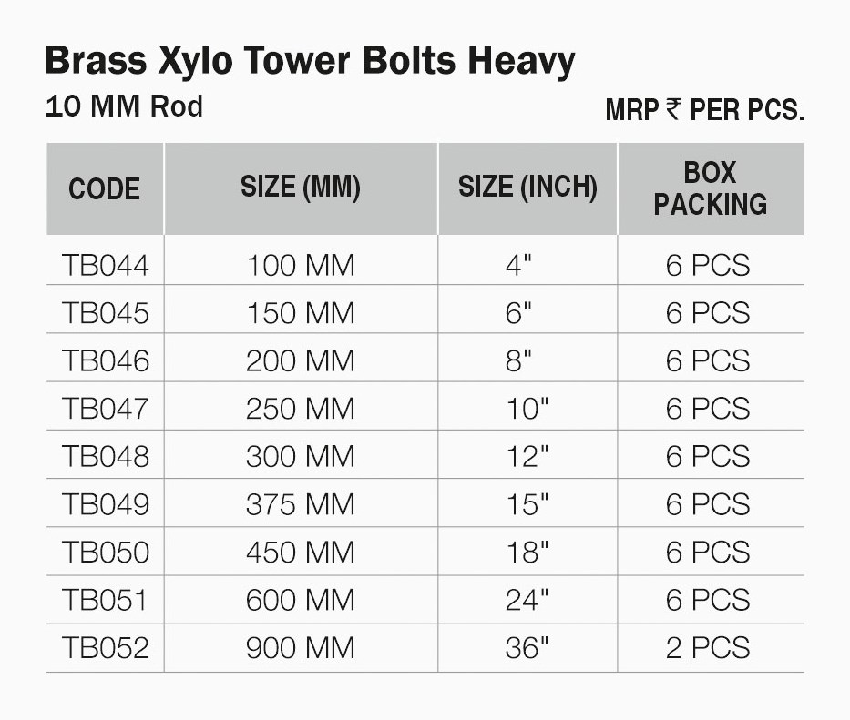 The Xylo Tower Bolt from PINE Hardware is a high‑quality tower bolt locking solution designed to secure doors, windows, cabinets, and other fixtures with reliable performance and timeless style. The Xylo Tower Bolt features a strong solid brass construction and precision‑engineered sliding mechanism, delivering smooth operation and superior durability for everyday use.
